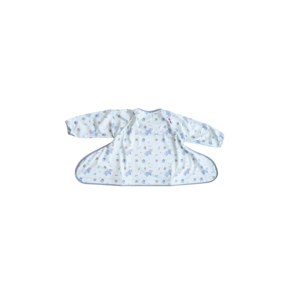 Baveta moderna cu maneci lungi, cu design vesel cu hipopotami, extrem de utila pentru a proteja hainutele copilasului atunci cand mananca sau cand se joaca. Se poate utiliza ca atare sau daca doriti o baveta de schimb pentru kit-urile pentru hranire Tidy Tot.