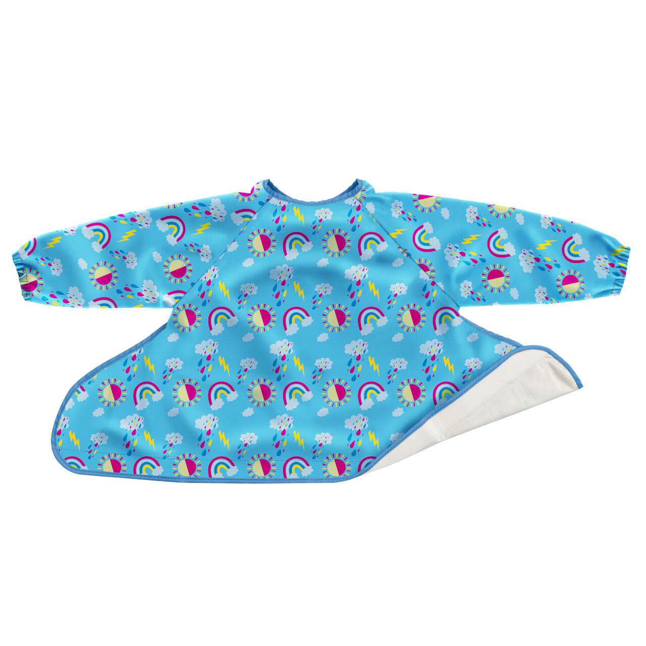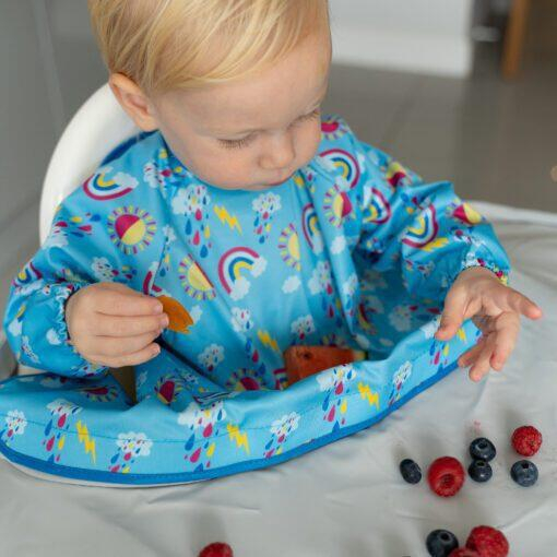 Baveta moderna cu maneci lungi, extrem de utila pentru a proteja hainutele copilasului atunci cand mananca sau cand se joaca. Se poate utiliza ca atare sau daca doriti o baveta de schimb pentru kit-urile pentru hranire Tidy Tot.