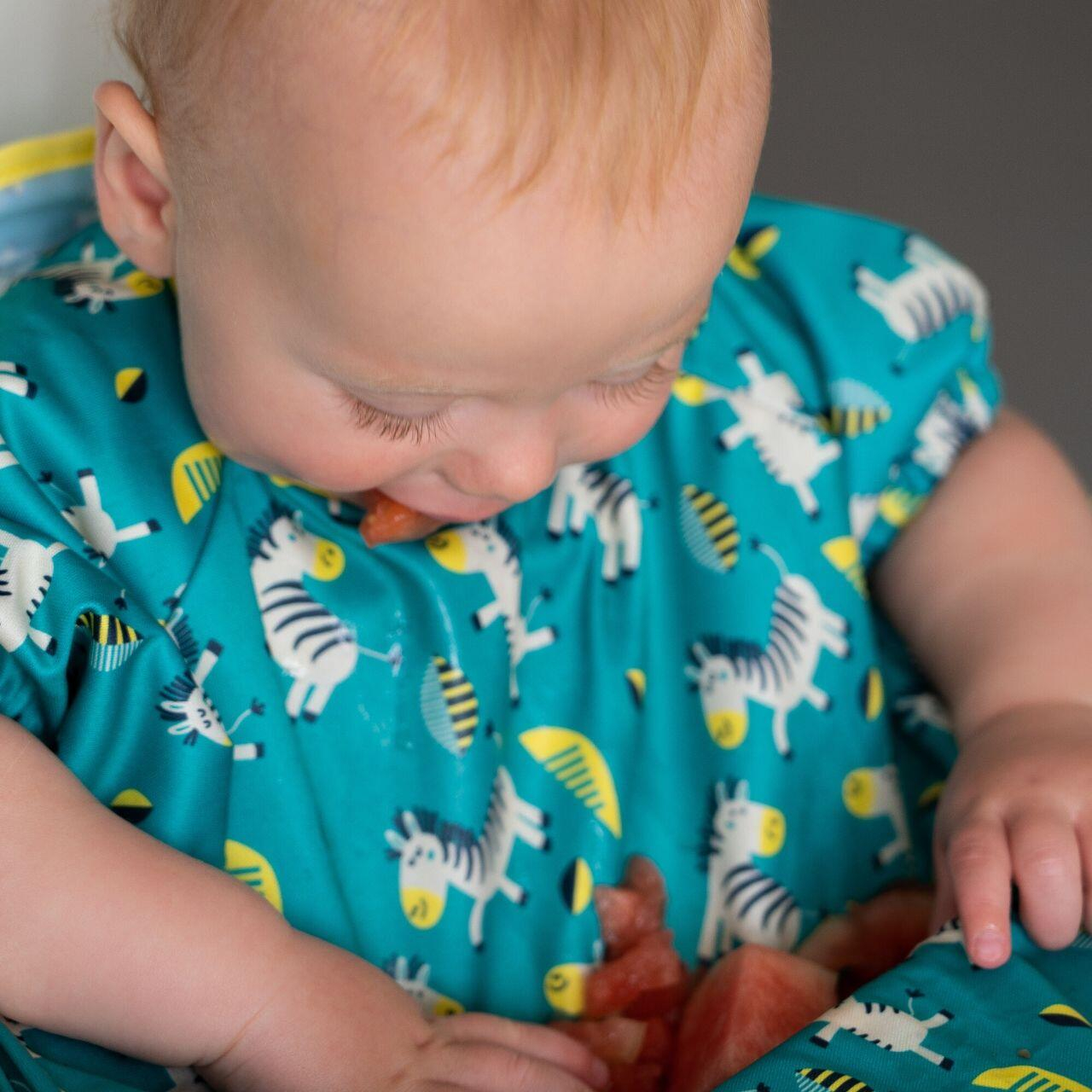 Cand nu mai aveti nevoie in mod regulat de protectia completa oferita de kit-ul de hranire Tidy Tot, noua baveta lunga va deveni cel mai bun prieten al dvs. Pentru bebelusi si copii mici pana la 2 ani, aceasta baveta ofera protectie completa in timpul meselor si a sesiunilor de joc, fiind una dintre cele mai lungi bavete disponibile pe piata.