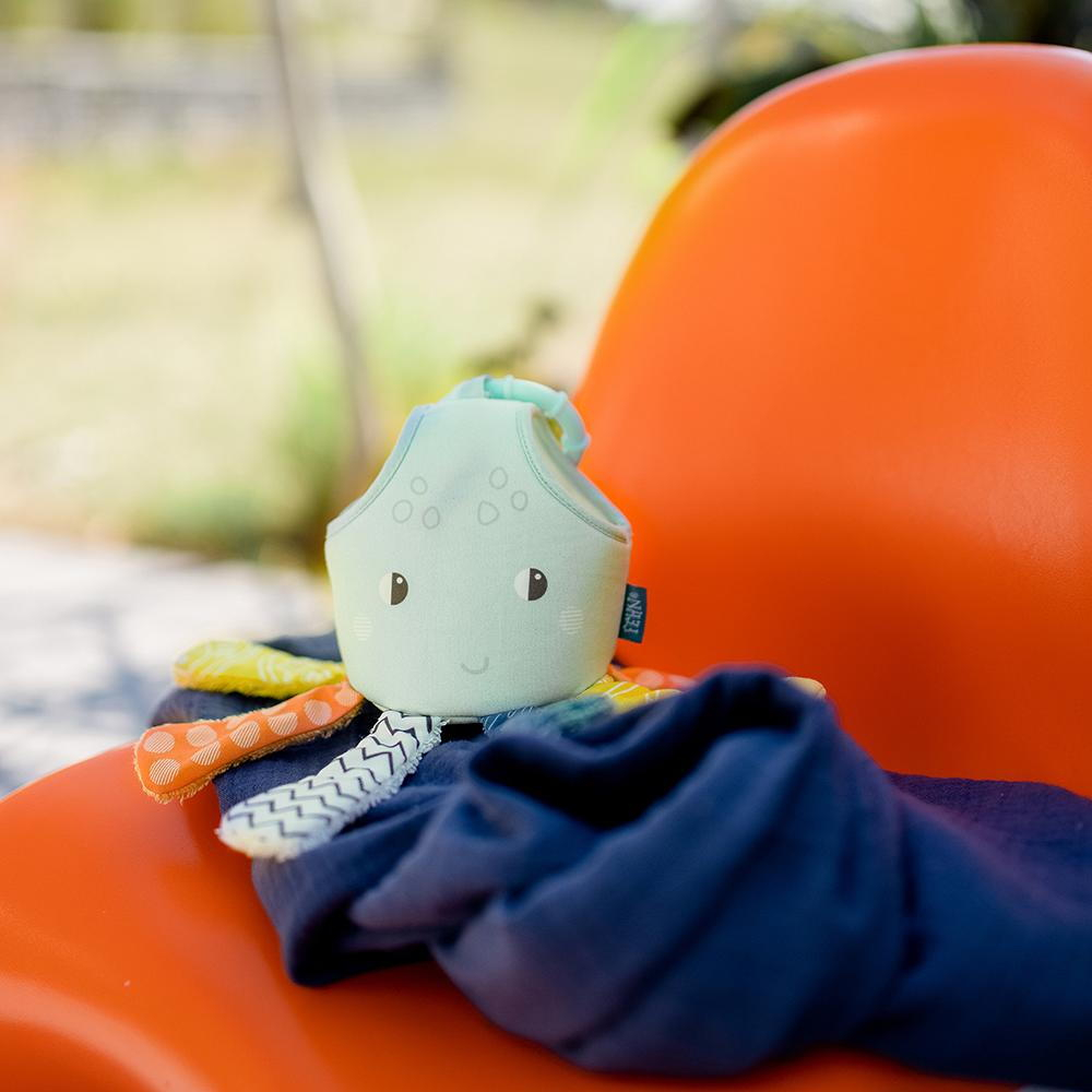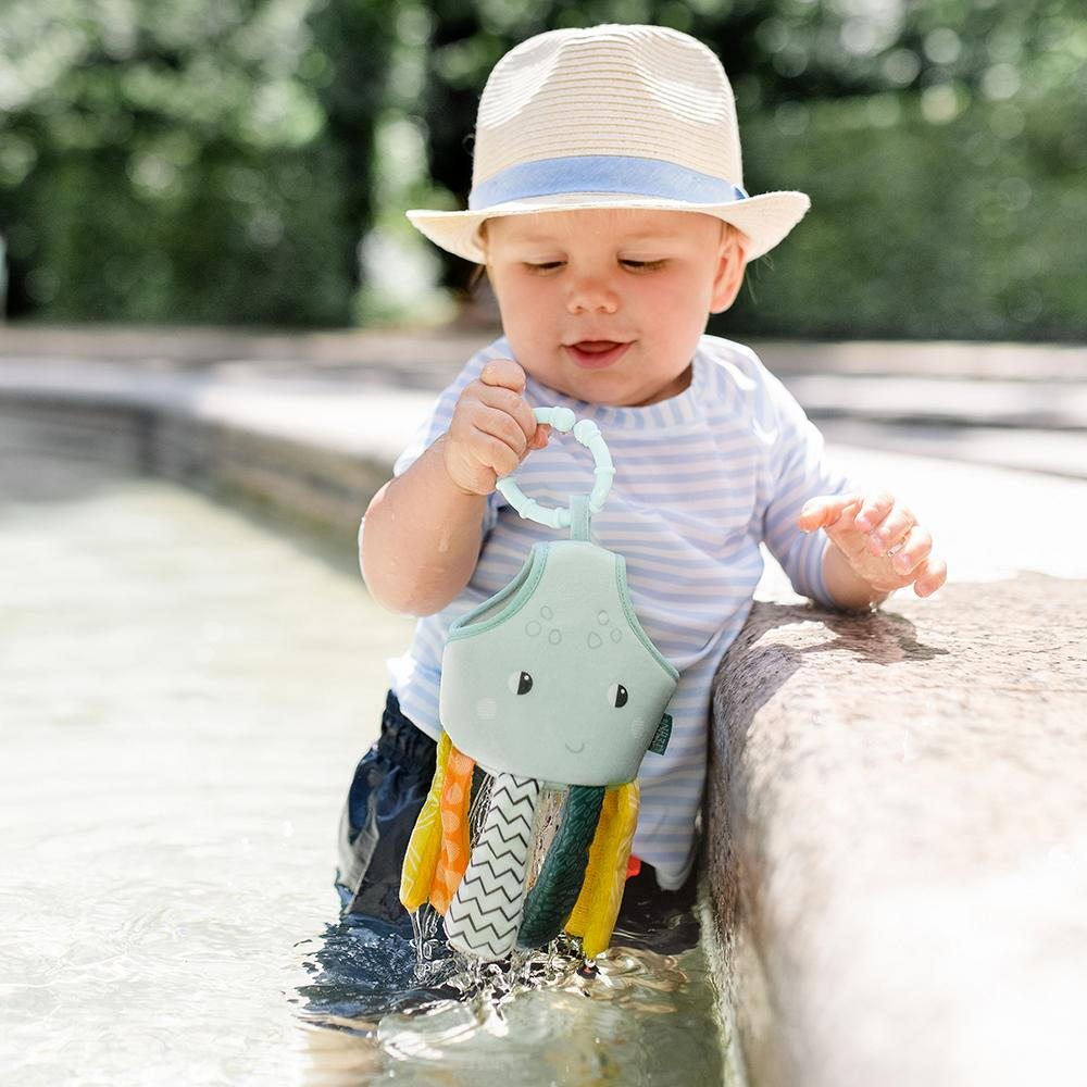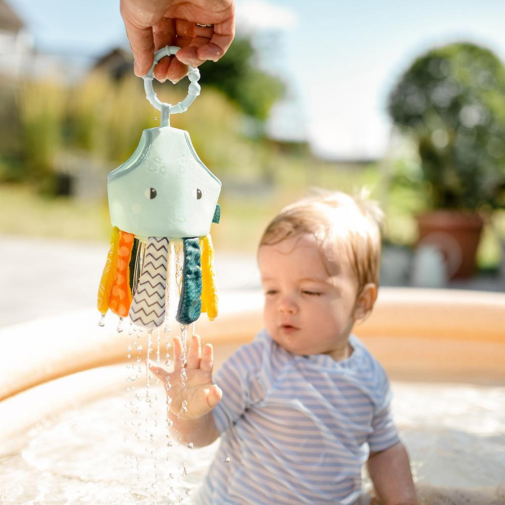 • scufundati simpaticul animalut marin in apa si ridicati-l cu ajutorul inelului de prindere, apoi veti vedea cum din tentaculele sale stropeste apa veselindu-i pe cei mici
