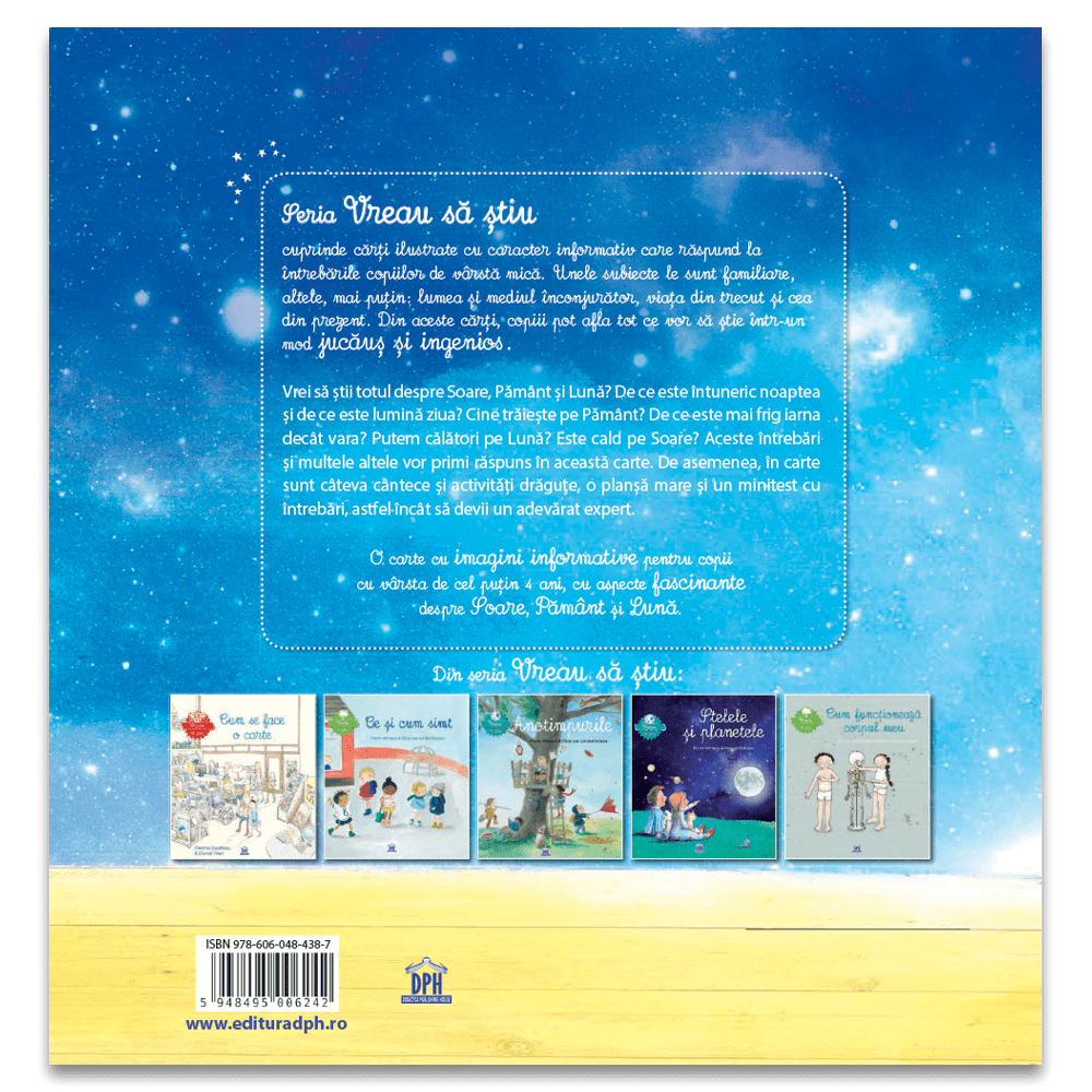 Noua carte din seria DPH -Vreau sa stiu cuprinde numeroase raspunsuri la multe intrebari precum: ''Vrei sa stii totul despre Soare, Pamant si Luna?'', ''De ce este intuneric noaptea si de ce este lumina ziua?'', ''Cine traieste pe Pamant?'', ''De ce este mai frig iarna decat vara?'', ''Putem calatori pe Luna?'', ''Este cald pe Soare?''.