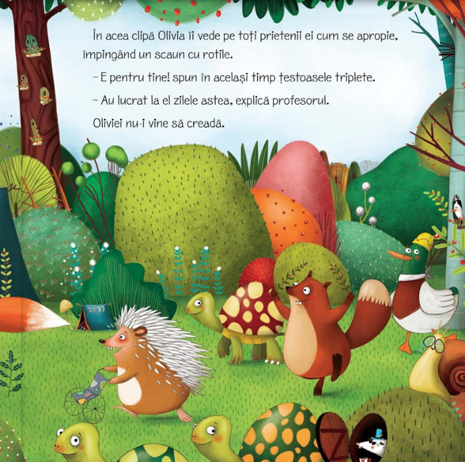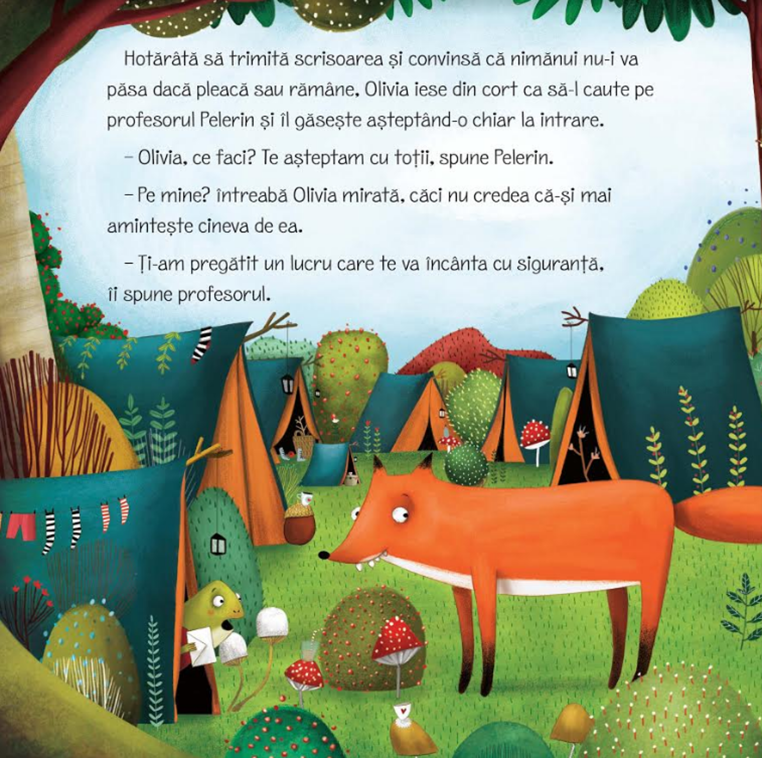 Pentru prietenii din padure, sosirea verii inseamna un singur lucru: pleaca in tabara! Dar pentru Olivia nu e vacanta la care se astepta: si-a rupt piciorul si nu se mai poate juca nimic. Prietenli ei se distreaza de minune... oare nu se gandesc deloc la ea? Si totusi, Olivia nu este singura, asa cum va descoperi curand. Te poti simti singur chiar daca esti inconjurat de lume, asa cum te poti simti aproape de cei dragi chiar si in singuratate. lubirea nu tine cont de distanta.