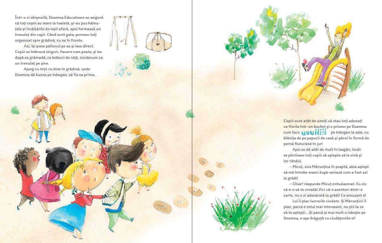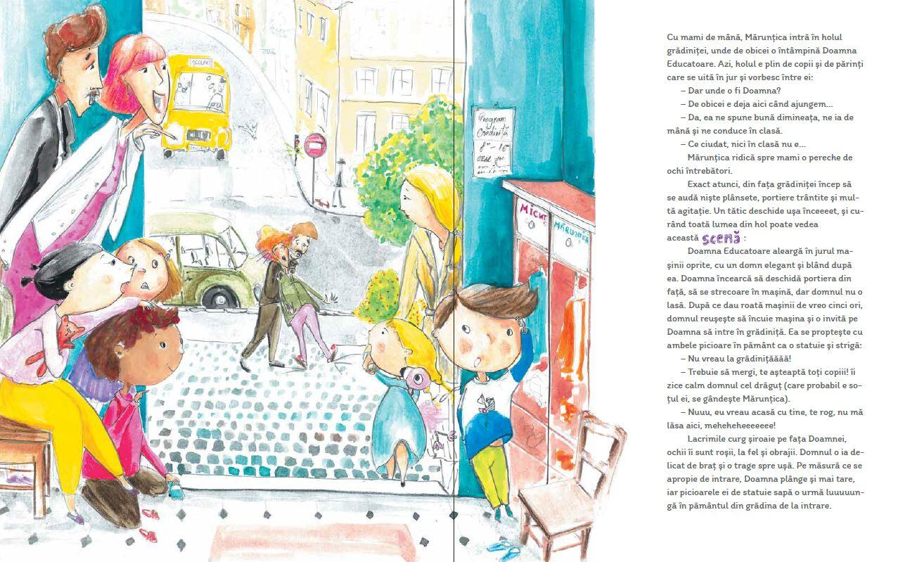 Dupa ce Mami si Tati s-au purtat ciudat si foarte ciudat, acum e randul Doamnei Educatoare sa faca lucrurile pe dos. Doamna, care e mereu atat de aranjata, de calma, care stie sa cante, sa picteze si sa spuna poezii atat de frumos, care e mereu acolo cu bratele deschise pentru copii, care stie sa-i impace si sa-i linisteasca, de data asta se poarta bizar. Vine la gradinita in pijamale, nu vrea sa ramana cu copiii si plange ca-i e dor de sotul ei, nu respecta niciun program, se inghesuie sa se dea doar ea pe toboganul din curte, se asaza la masa fara sa se spele pe maini, e complet lipsita de maniere, nu vrea sa doarma la pranz, iar seara decide ca vrea sa ramana la gradinita peste noapte, sa doarma ca Alba ca Zapada, pe paturile piticilor, adica ale copiilor.