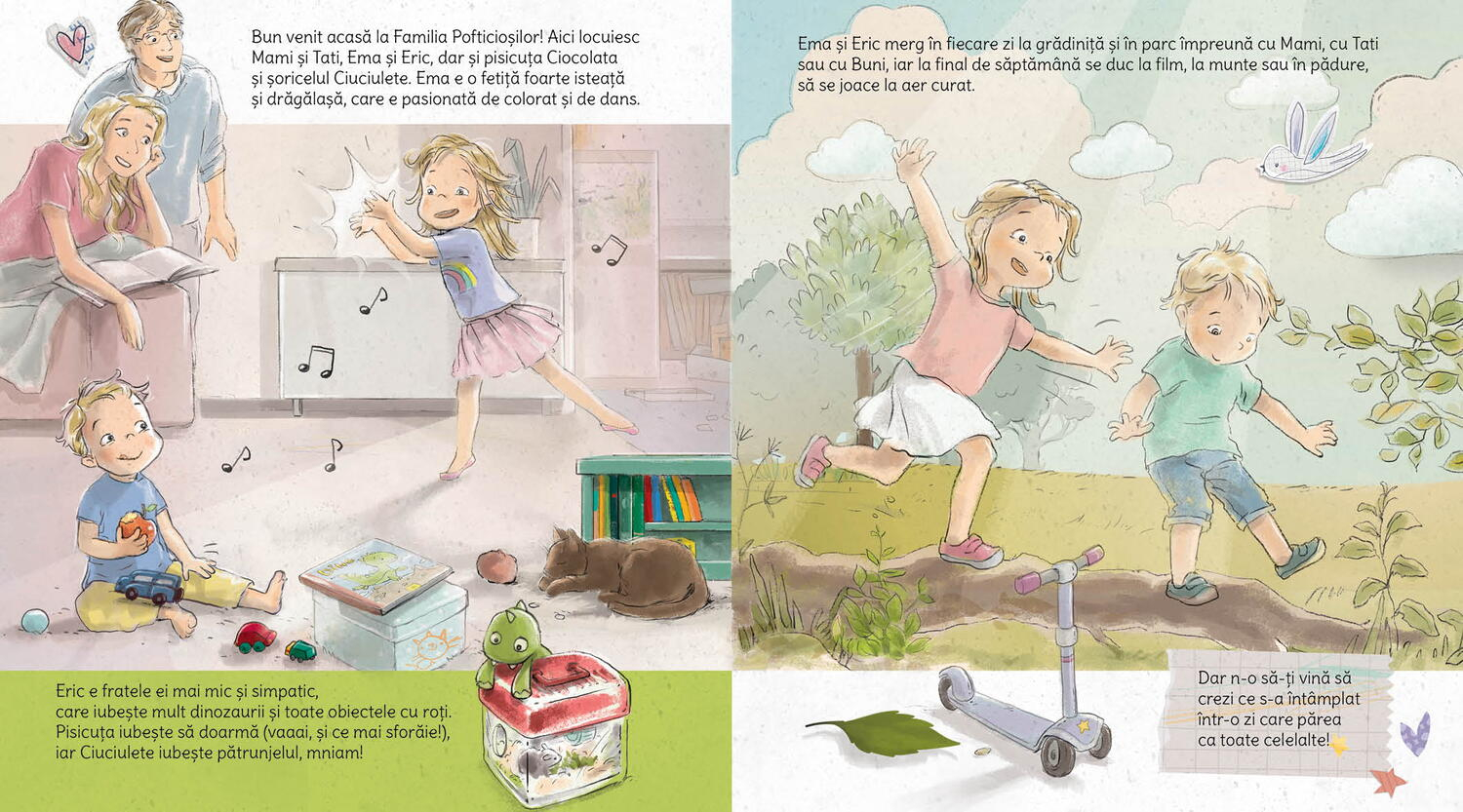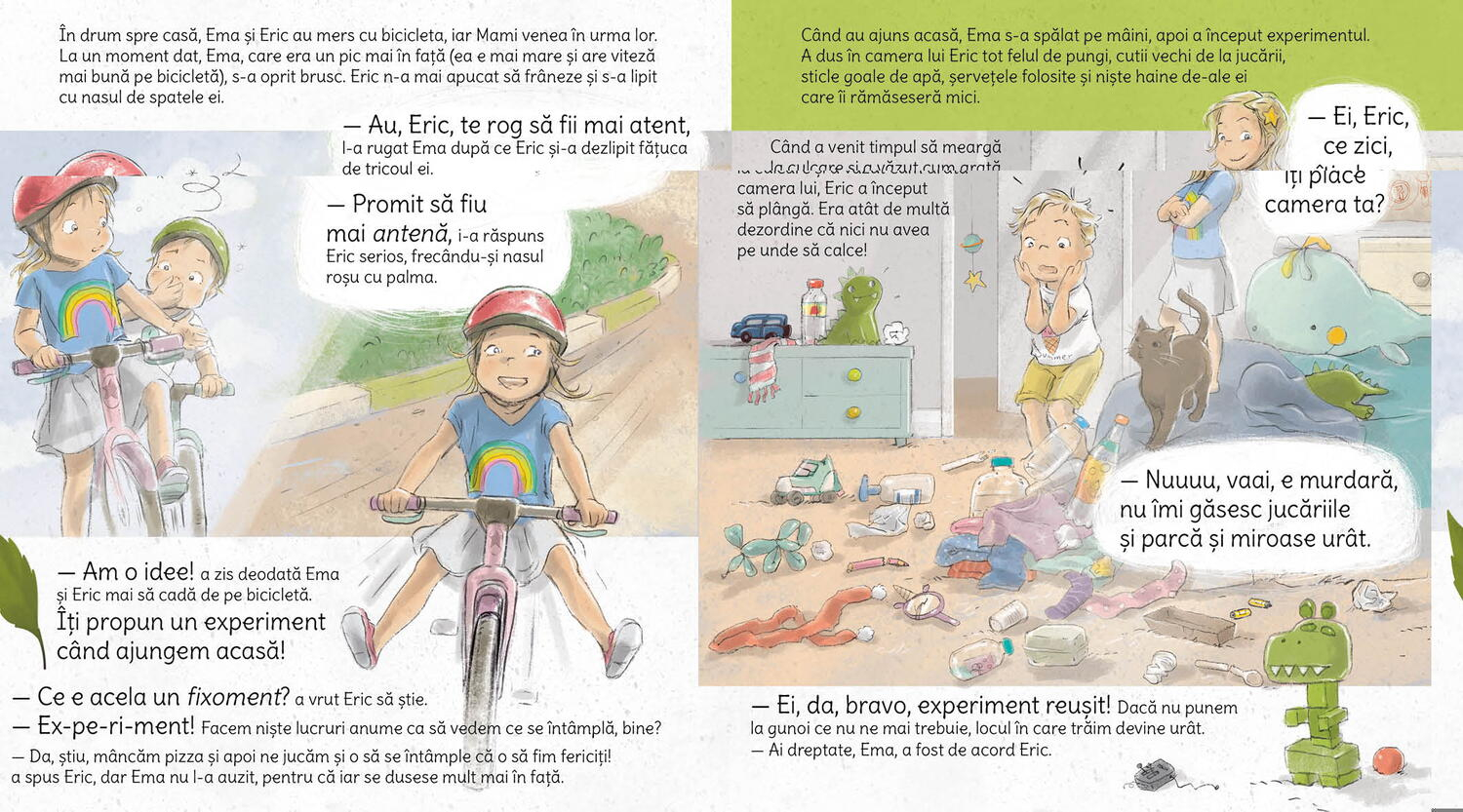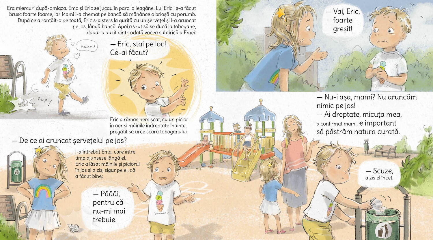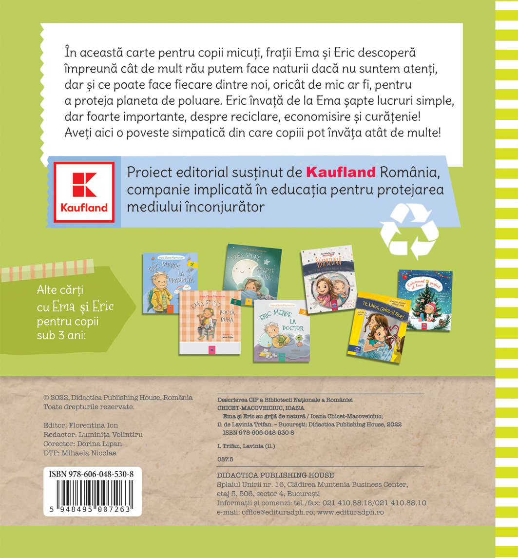 In aceasta carte pentru copii micuti, fratii Ema si Eric descopera impreuna cat de mult rau putem face naturii daca nu suntem atenti, dar si ce poate face fiecare dintre noi, oricat de mic ar fi, pentru a proteja planeta de poluare. Eric invata de la Ema sapte lucruri simple, dar foarte importante, despre reciclare, economisire si curatenie!