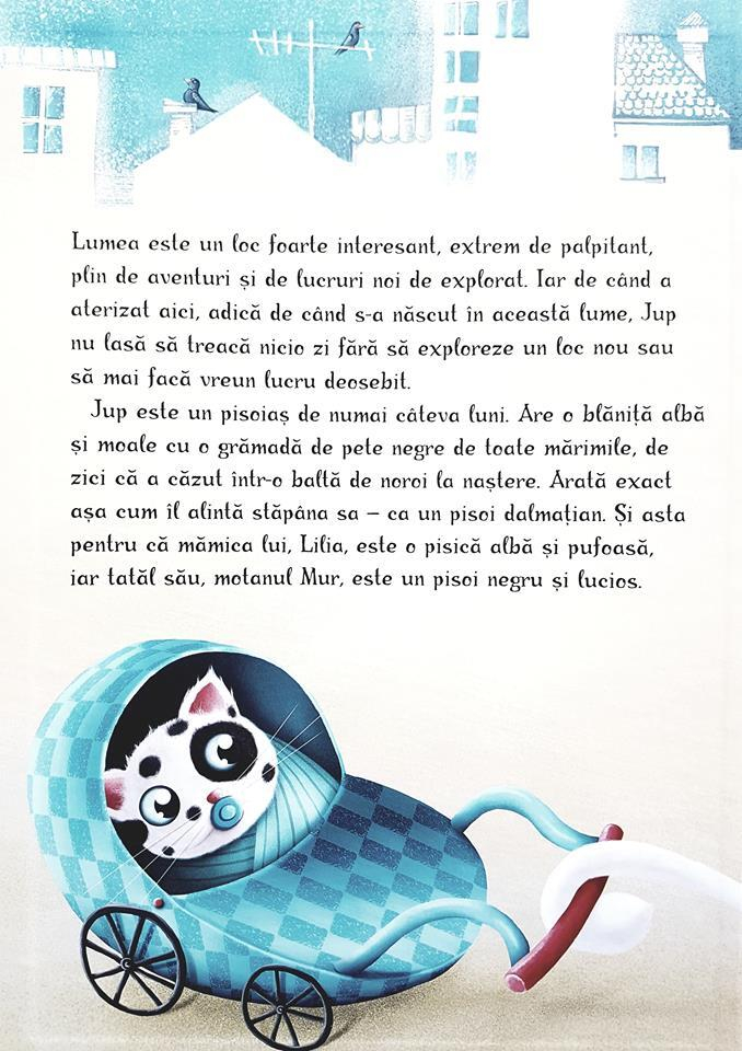 Jup are blanita alba si moale, plina de pete negre. Arata exact asa cum il alinta stapana sa – ca un pisoi dalmatian. in lipsa unor frati si surori cu care sa se joace, se imprieteneste cu Jack, batranul dulau din vecini, si isi umple timpul cu ceea ce el numeste „exploratul“. Iar „exploratul“ include, de obicei, cate o trasnaie, cum ar fi incercarea de a zbura. Pentru ca nu-i nimic in regula cu a visa si a incerca, nu-i asa?