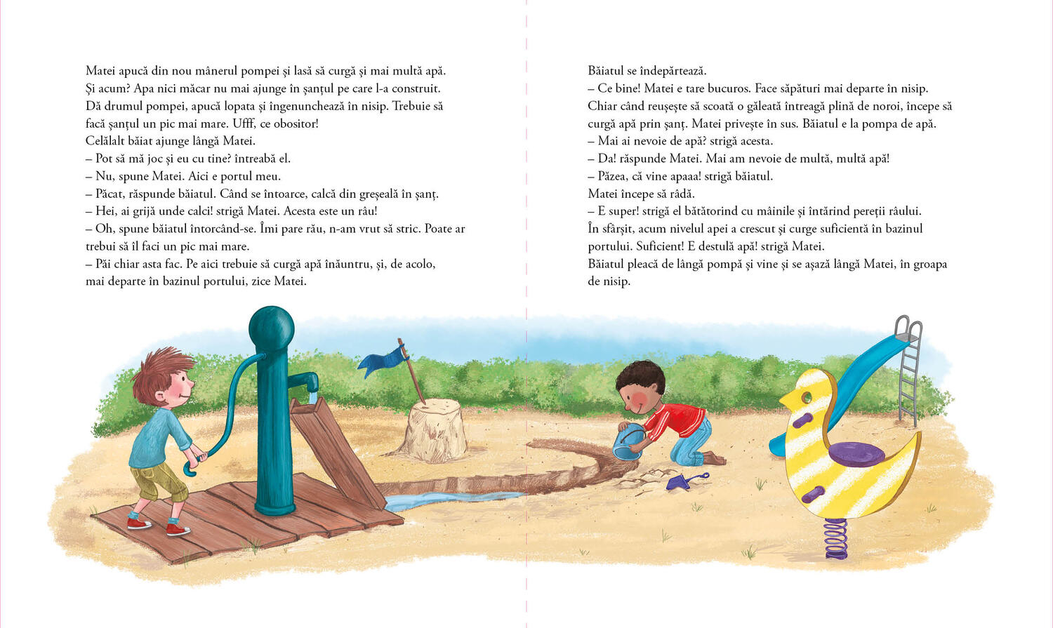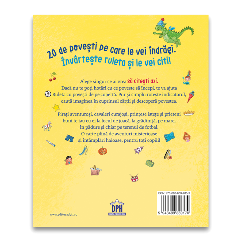 Aceasta carte de lectura capteaza imediat atentia: copiii folosesc Ruleta cu Povesti de pe coperta si este deja clar ce se va citi. Pur si simplu, trebuie sa roteasca indicatorul, sa caute imaginea in cuprinsul cartii si sa descopere povestea. Chiar si cei mici vor gasi rapid imaginile simple din cuprins. Cele 20 de povesti de diferite lungimi se invart in jurul subiectelor preferate: pirati aventurosi, cavaleri curajosi, printese istete si prieteni buni, care va invita la locul de joaca, la gradinita, pe mare, in padure si chiar pe terenul de fotbal.