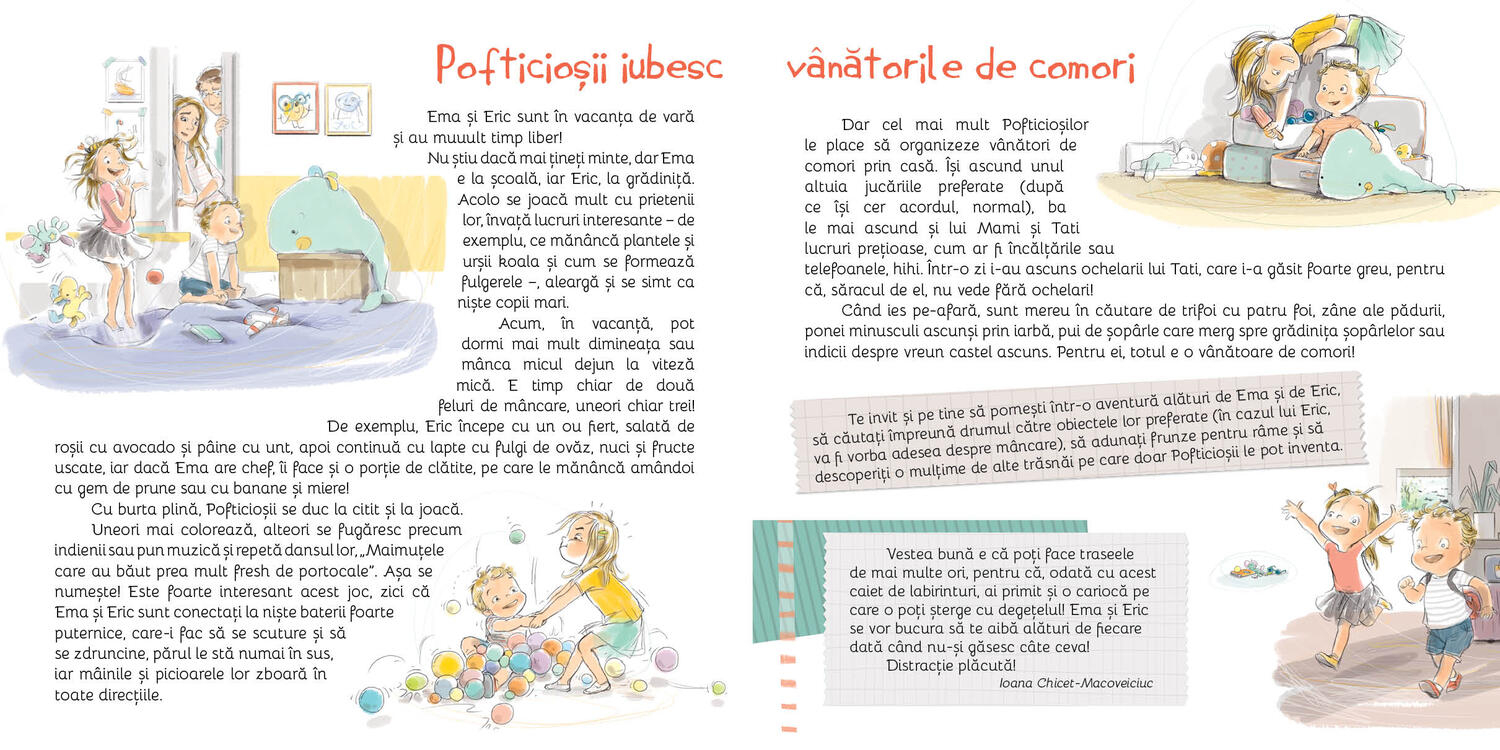 Ema si Eric iubesc vanatorile de comori prin casa. Isi ascund unul altuia jucariile preferate (dupa ce isi cer acordul), dar le mai ascund si lui Mami si Tati lucruri pretioase, cum ar fi incaltarile sau telefoanele. Cand ies afara, sunt mereu in cautare de floricele, ponei minusculi ascunsi prin iarba, pui de soparle care merg spre gradinita soparlelor sau indicii despre vreun castel ascuns. Pentru ei, totul e o vanatoare de comori!