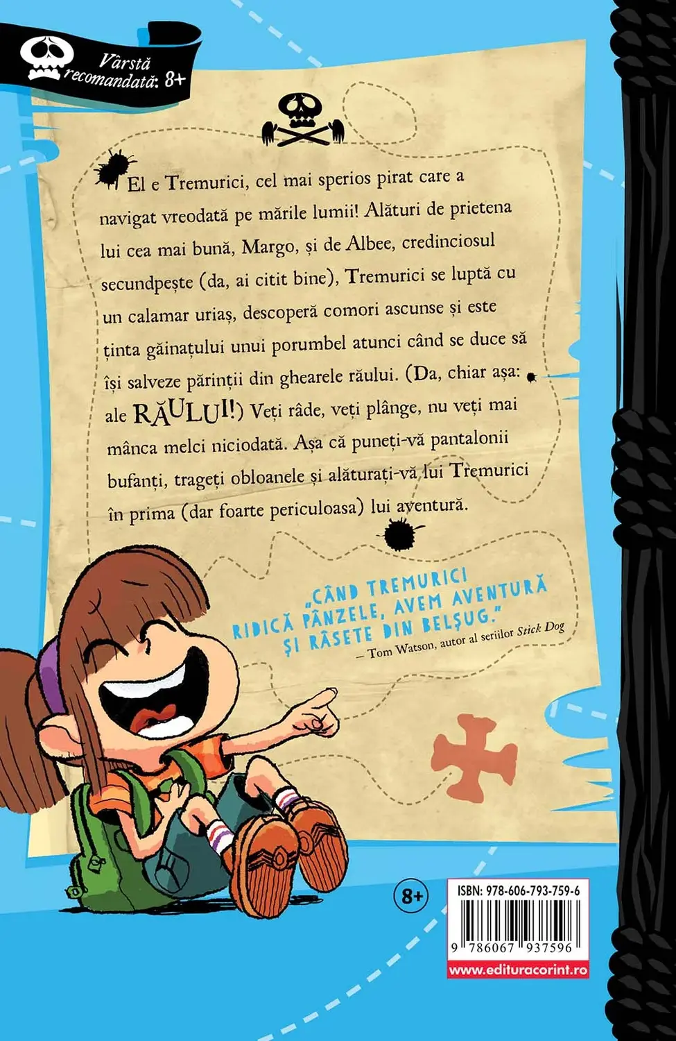 El e Tremurici, cel mai sperios pirat care a navigat vreodata pe marile lumii! Alaturi de prietena lui cea mai buna, Margo, si de Albee, credinciosul secund peste (da, ai citit bine), Tremurici se lupta cu un calamar urias, descopera comori ascunse si este tinta gainatului unui porumbel atunci cand se duce sa isi salveze parintii din ghearele raului. (Da, chiar asa: ale RAULUI!) Veti rade, veti plange, nu veti mai manca melci niciodata. Asa ca puneti-va pantalonii bufanti, trageti obloanele si alaturati-va lui Tremurici in prima (dar foarte periculoasa) lui aventura.