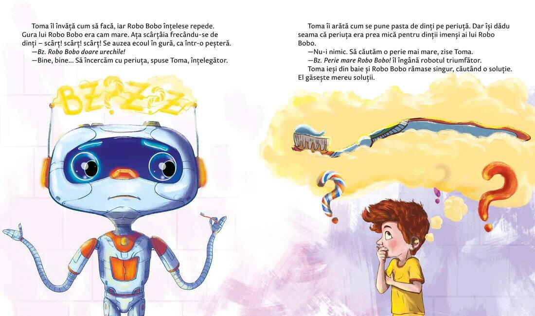 Robo Bobo este cadoul primit de un baietel de ziua lui. Este un robot de doua ori mai inalt decat copilul. Si parca tot de doua ori mai obraznic si mai pus pe sotii. Copilul trebuie sa-l invete sa se poarte ca un om. Prima lectie: spalatul pe dinti. Usor, nu? Toti copiii stiu sa se spele pe dinti, dar Robo Bobo face atatea greseli incat se sperie si pisica, si ariciul.
