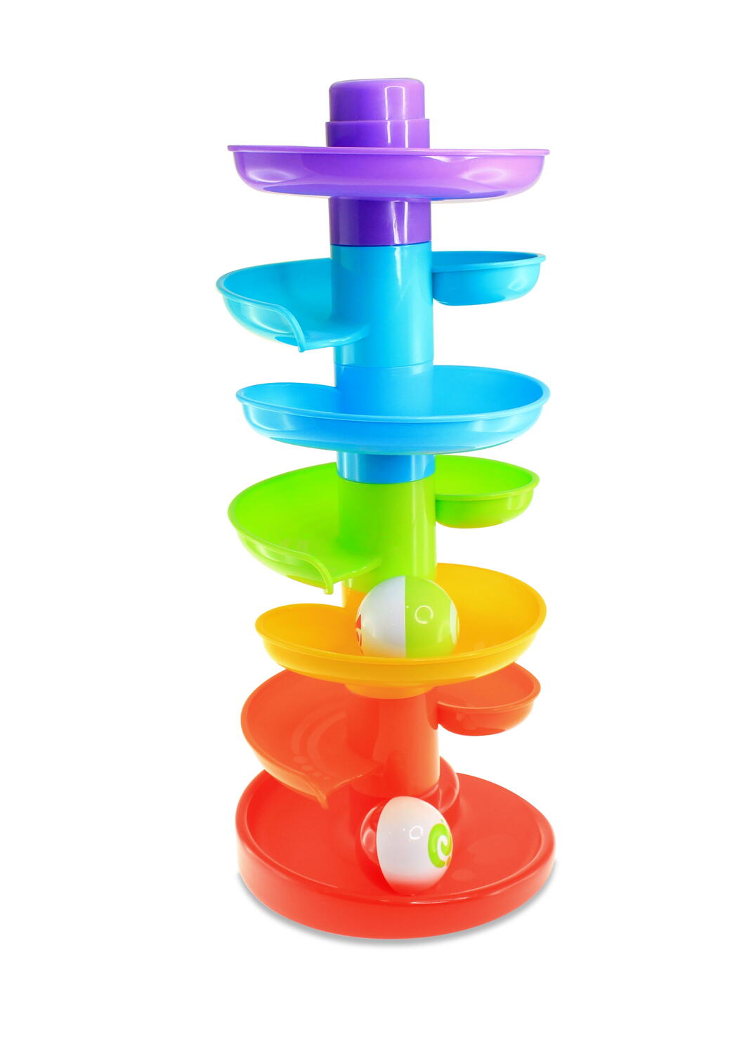 Un joc turnulet cu bile, la care copilul pune bilele in varf si le urmareste cum coboara pe traseu