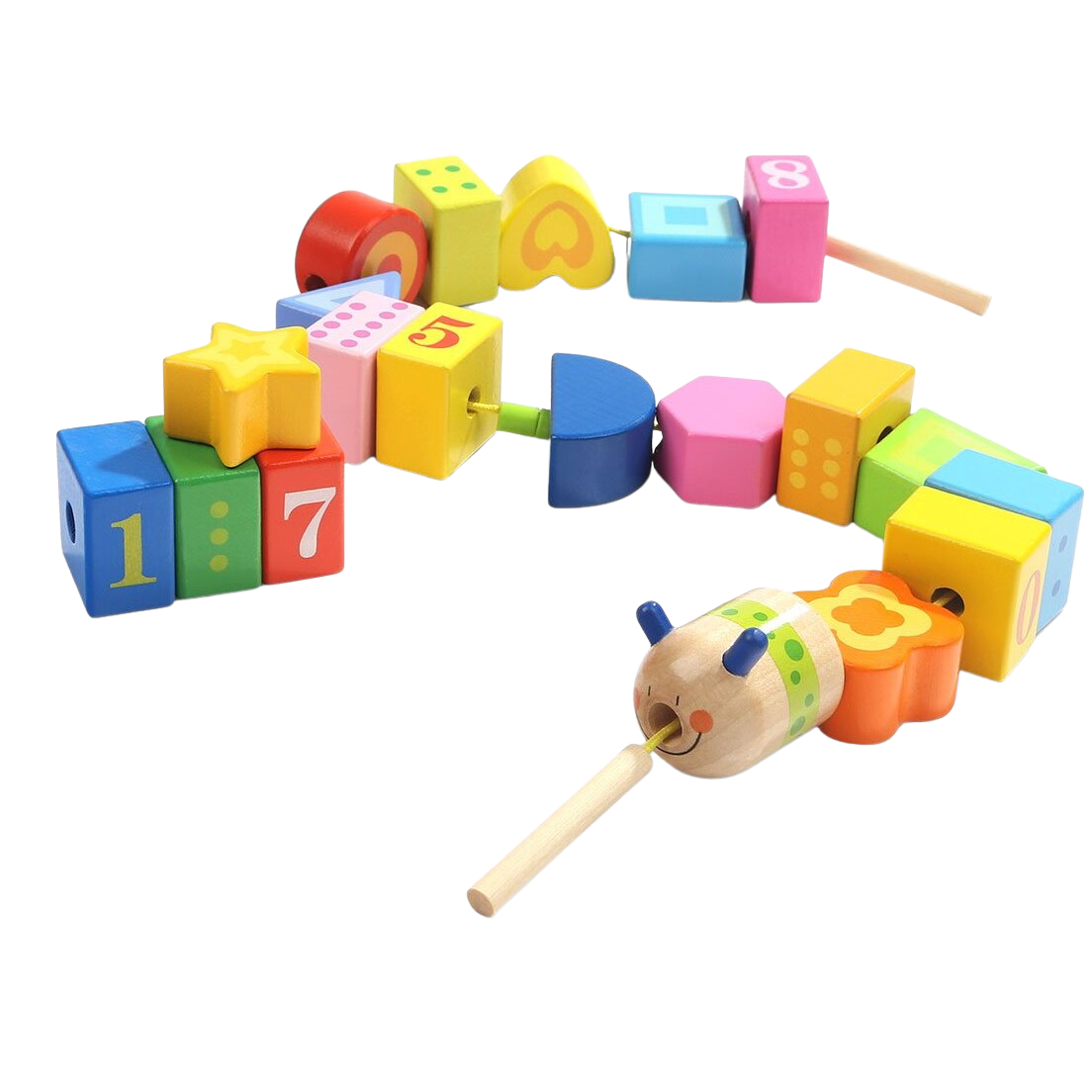 - poate fi folosita ca jucarie de snuruit pentru dezvoltarea abilitatilor motrice si a gandirii logice – toate componentele omidutei au orificii prin care copilul va trece siretul inclus, snuruind incet, incet, toate piesele pana cand omida va fi completa