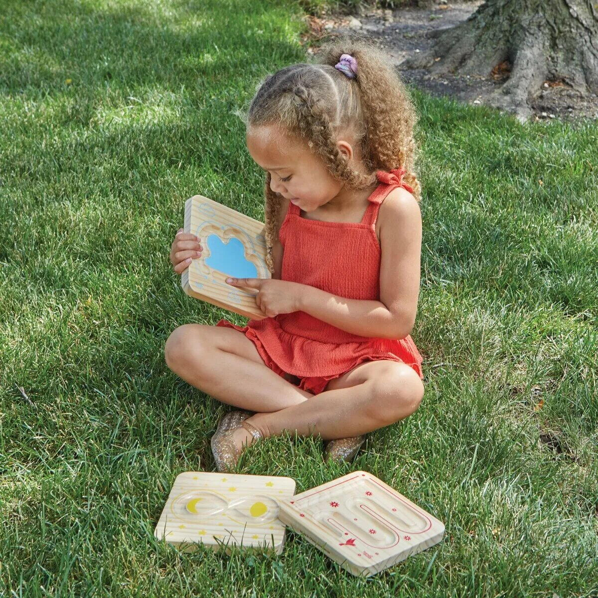 - Fiecare tabla dubla din lemn are un design tactil atractiv care ii ghideaza pe copii printr-un tipar de respiratie, sprijinind dezvoltarea atentiei constiente si a autocontrolului