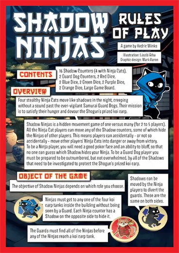 Pisicile ninja se strecoara prin umbră pentru a pacali cainii de paza samurai ai Shogunului si a devora pretiosii pestisori koi din palatul sau. Jucatorii aleg fie sa fie Pisici Ninja iscusite care incearca sa patrunda in conac, fie Caini de paza loiali care trebuie sa apere comoara piscicola. La inceput, pisicile ninja trebuie sa coopereze pentru a avea o sansa sa invinga paznicii... dar doar una poate castiga, asa ca pe masura ce jocul avansează, colaborarea devine tot mai dificila. Vei avea nevoie de nervi de otel si o fata inexpresiva pentru a pacali si depasi adversarii.