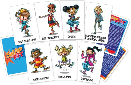 - Fii primul care observa cartile identice si striga „Snap Fit!” ca sa castigi… iar ceilalti trebuie sa faca actiunea trasnita de pe carti… timp de 10 secunde