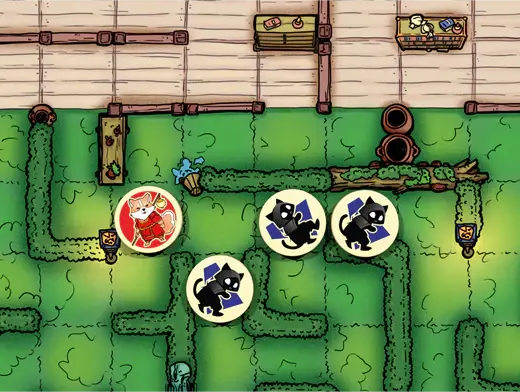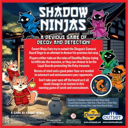 Pisicile ninja se strecoara prin umbră pentru a pacali cainii de paza samurai ai Shogunului si a devora pretiosii pestisori koi din palatul sau. Jucatorii aleg fie sa fie Pisici Ninja iscusite care incearca sa patrunda in conac, fie Caini de paza loiali care trebuie sa apere comoara piscicola. La inceput, pisicile ninja trebuie sa coopereze pentru a avea o sansa sa invinga paznicii... dar doar una poate castiga, asa ca pe masura ce jocul avansează, colaborarea devine tot mai dificila. Vei avea nevoie de nervi de otel si o fata inexpresiva pentru a pacali si depasi adversarii.