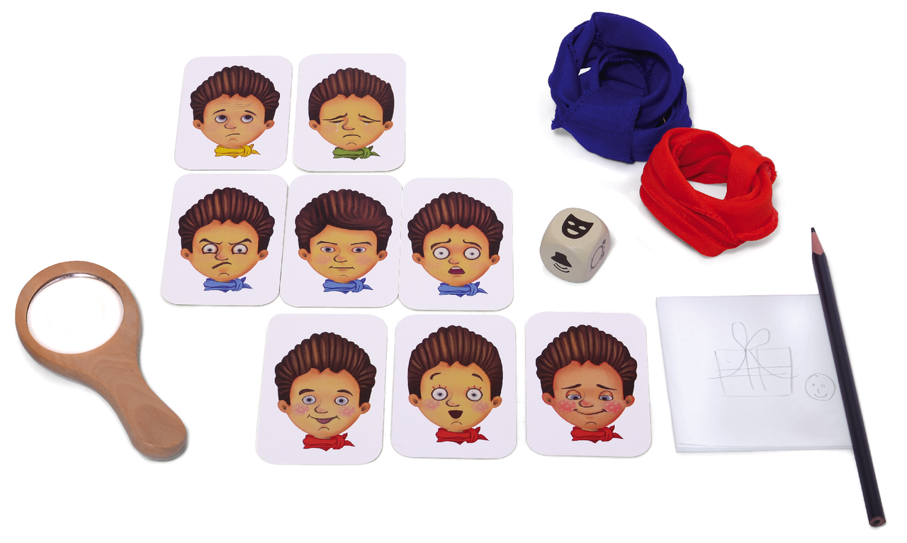 Jocul 1- Fiecare jucator isi alege o esarfa colorata si o poarta la gat. Imparte cate 4 carduri cu emotii fiecarui jucator. Restul cardurilor sunt asezate in teanc cu fata in jos, in mijlocul mesei. Cauta carduri cu emotii in aceeasi culoare cu esarfa pe care o porti. Deseneaza, mimeaza sau spune o poveste pentru ca ceilalti jucatori sa isi dea seama ce emotie cauti. Primul care strange un set de carduri castiga.