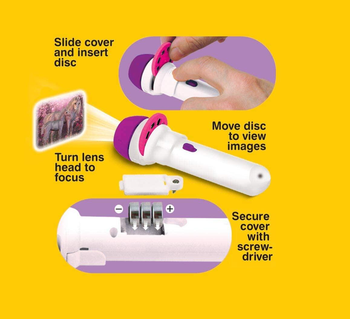 - foloseste acest proiector pentru a analiza in detaliu imagini uimitoare din lumea magica a zanelor si unicornilor pe care le poti proiecta cu usurinta pe peretii camerei tale