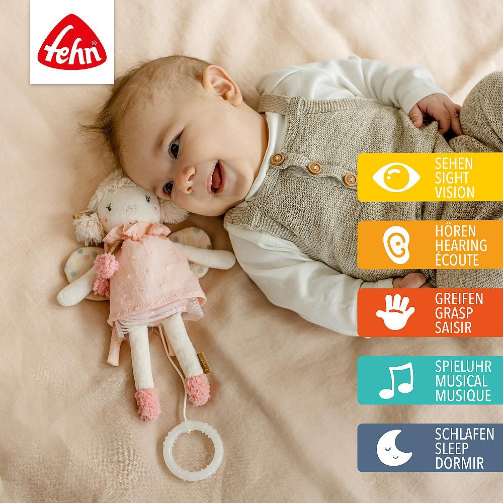 - Usor de atasat la patut sau carucior: Datorita dimensiunilor sale practice si a panglicilor de fixare, zana poate fi usor transportata, devenind un partener de incredere in calatorii sau plimbari. Este perfecta pentru atingeri blande si mangaieri, stimuland simtul tactil al bebelusului si dezvoltand imaginatia sa.
