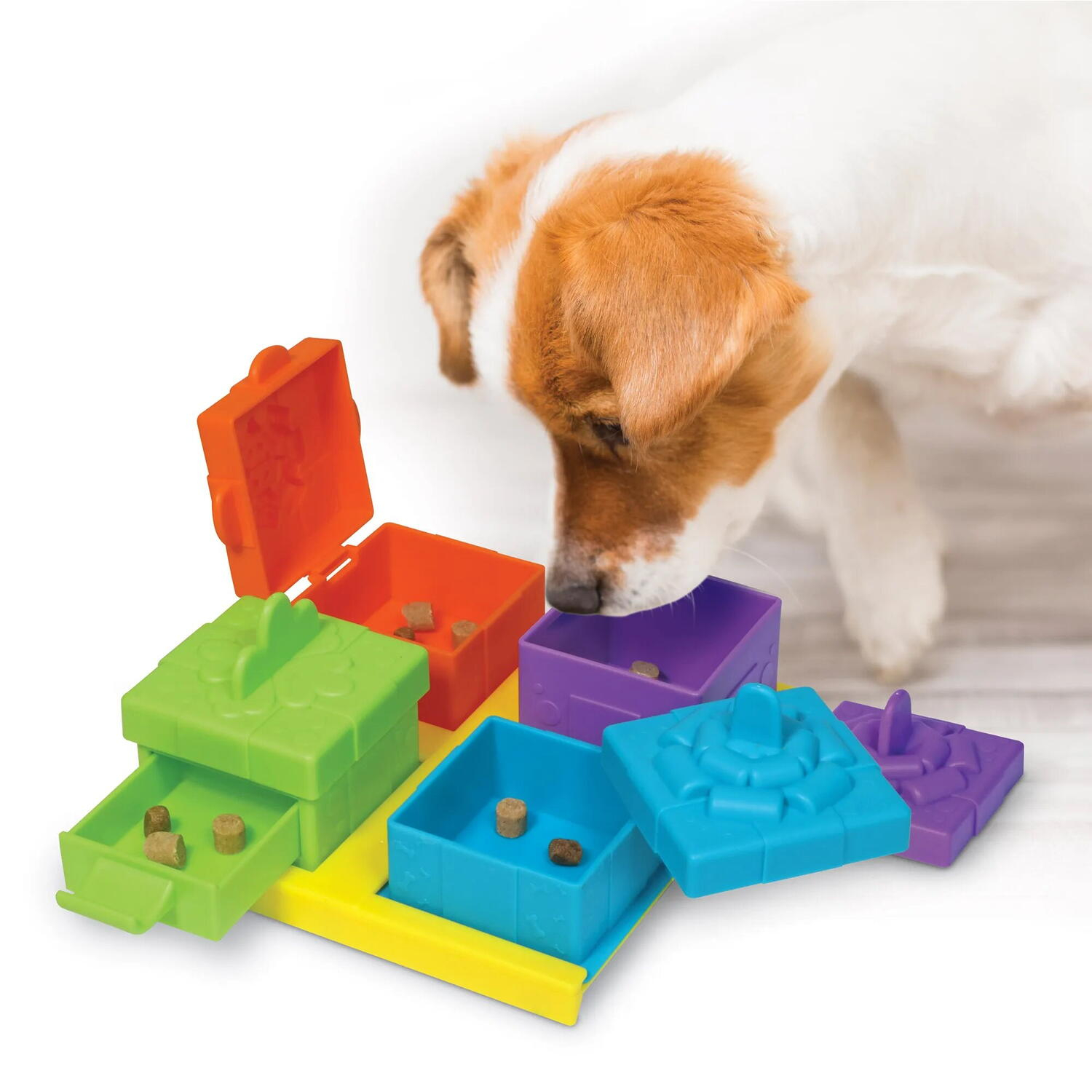 - cele patru cutiute de cadou se deschid in mod diferit, provocandu-i pe catei sa gliseze, sa roteasca, sa rastoarne si sa traga pentru a ajunge la delicioasele gustari
