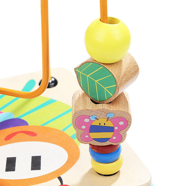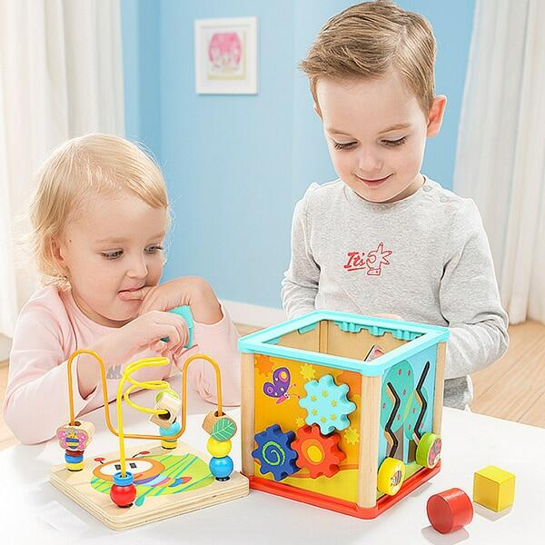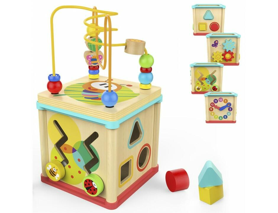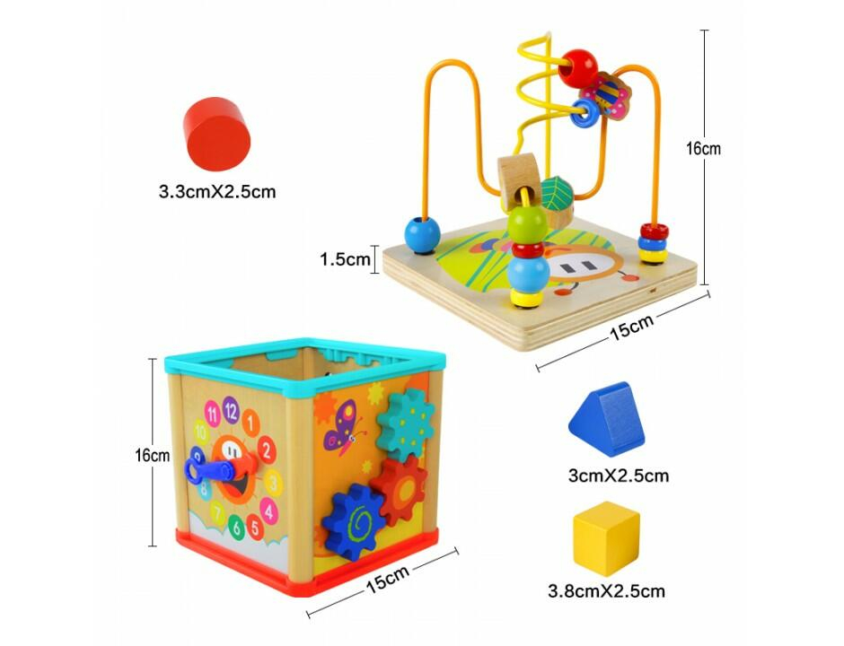 - cubul educativ din lemn cu cinci activitati include: sortator cu diferite forme geometrice colorate, un ceas vesel colorat, un labirint cu piese culisante (albinuta si buburuza), un capac cu labirint cu bile colorate si angrenaj cu roti dintate