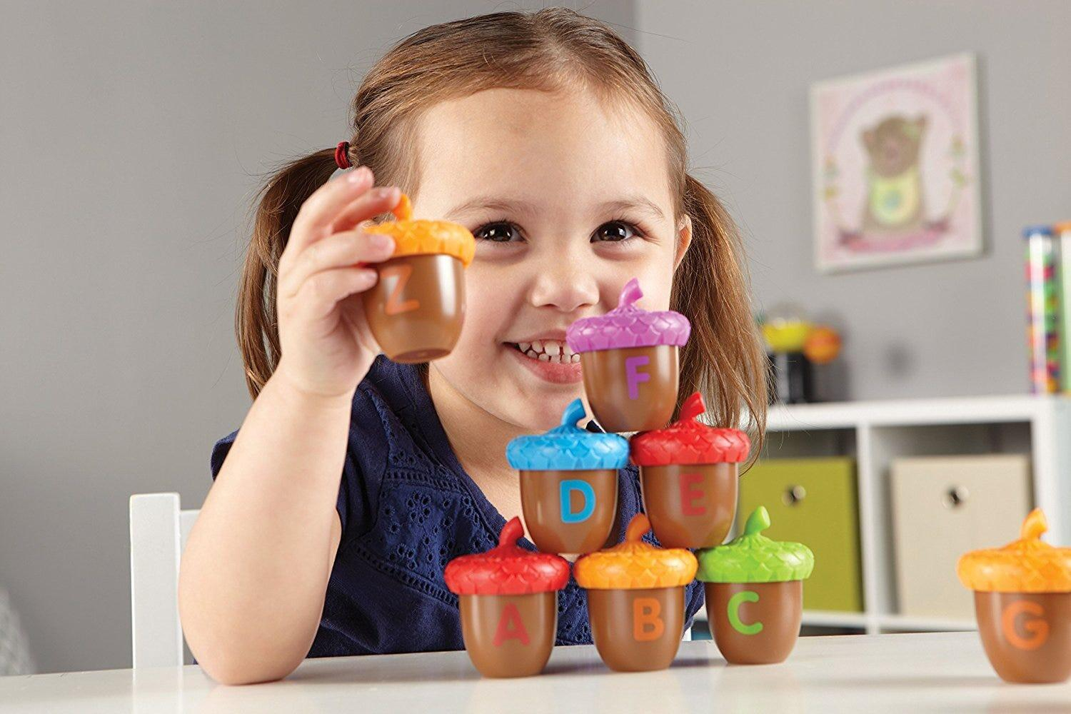 - cei mici pot potrivi literele mari cu cele mici pe masura ce asambleaza ghindele si se pot bucura de un joc de tip „ascunde si gaseste”, descoperind o surpriza in interiorul fiecarei ghinde