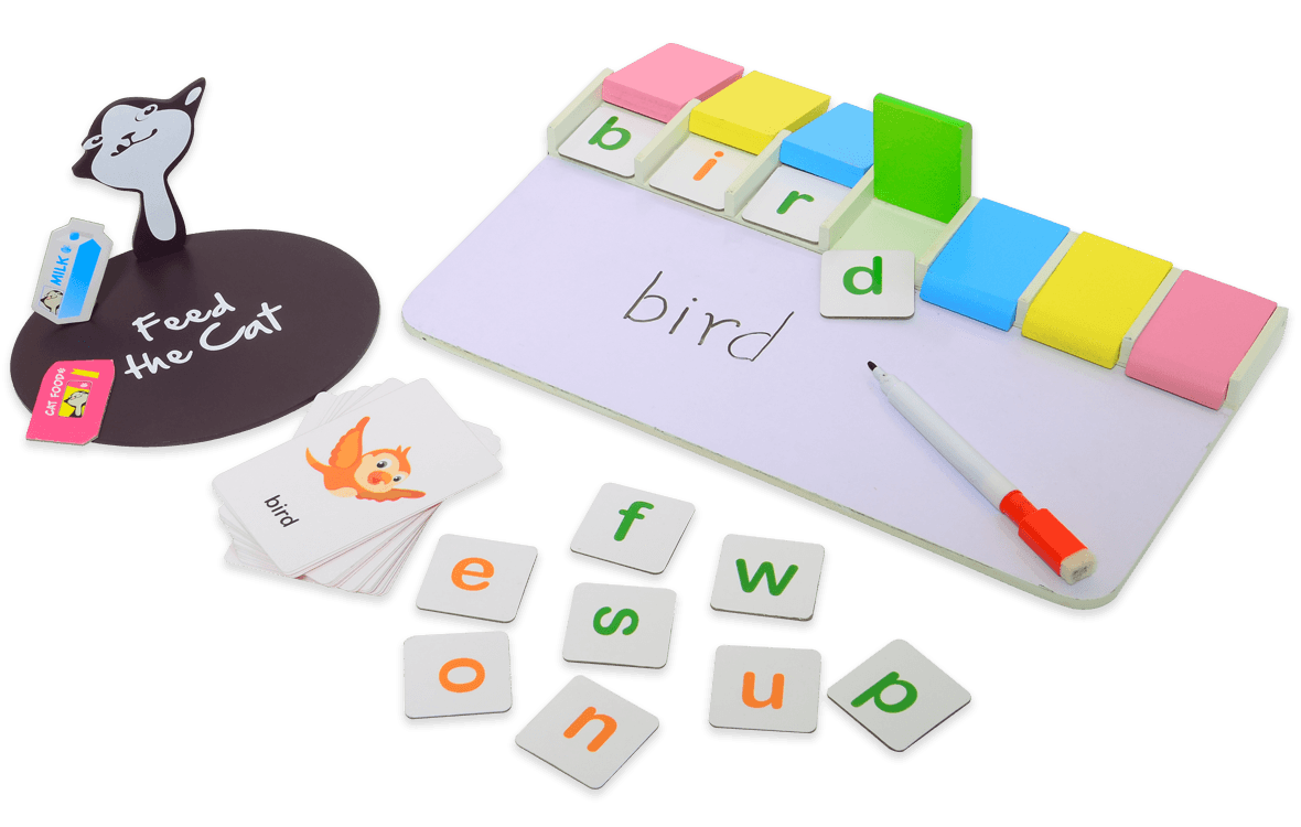 Regulament: Lasa copilul sa aleaga un card cu imagine si cuvant. Incurajeaza-l sa caute piesele cu literele care se regasesc in cuvantul de pe card. Pune in tavita pentru scris piesele cu litere in ordinea corecta pentru a obtine cuvantul de pe card. Studiaza cuvantul cu atentie si inchide "usitele". Apoi incearca sa iti amintesti cuvantul si sa il scrii pe tablita. Pentru a verfica daca ai scris corect, ridica "usitele" si verifica daca piesele cu litere se potrivesc cu cuvatul scris de tine. Incepe cu cuvinte formate din 3 litere si avanseaza la cuvinte cu 7 litere. Nu uita de pisicuta! Ea asteapta sa inveti un cuvant nou ca sa o poti hrani! Numarul de cuvinte invatate reprezinta tot atata mancare delicioasa pentru pisicuta ta. Dupa ceva vreme poti folosi un tabel pentru a monitoriza de cate ori hranesti pisica. Asigura-te ca pisica nu ramane nemancata nici macar o zi!