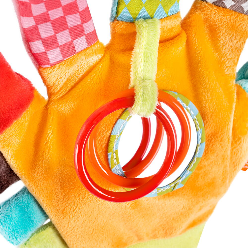 Elefantelul si maimutica jucausa sunt nerabdatori sa-si cunoasca viitorul prieten, iar aceasta manusa cu activitati ii va tine in suspans si va stimula simturile