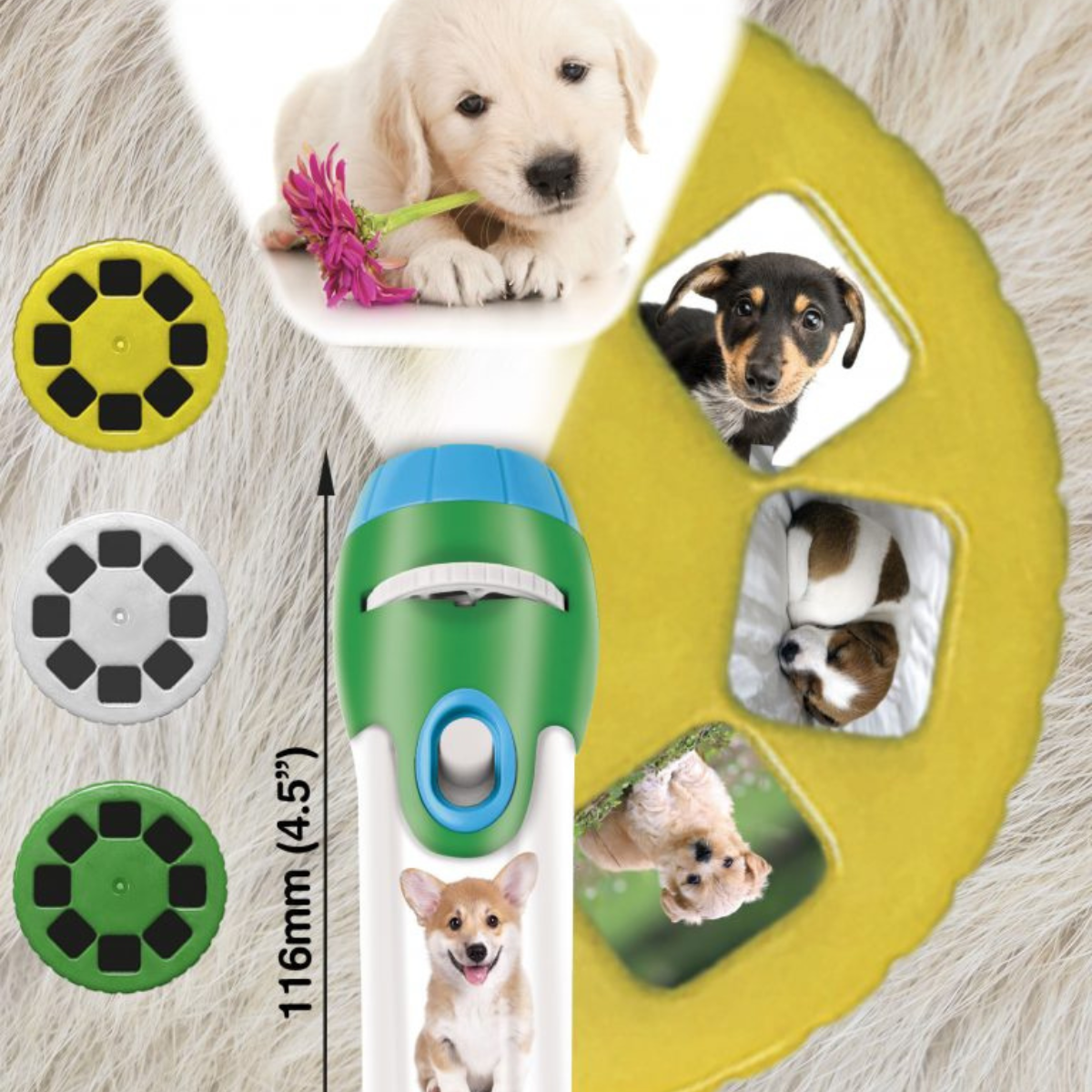 - include trei discuri tip diapozitiv cu 24 de imagini adorabile cu catelusi jucausi si prietenosi – de la priviri dulcege pana la momente haioase si pline de energie