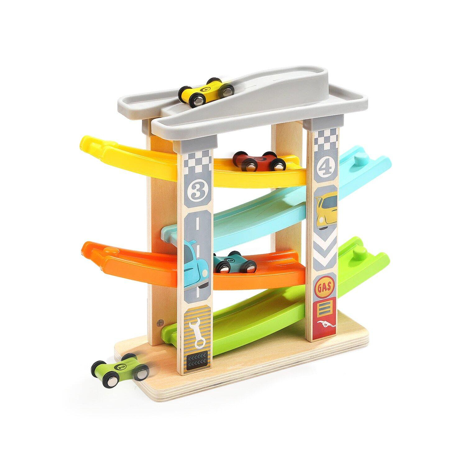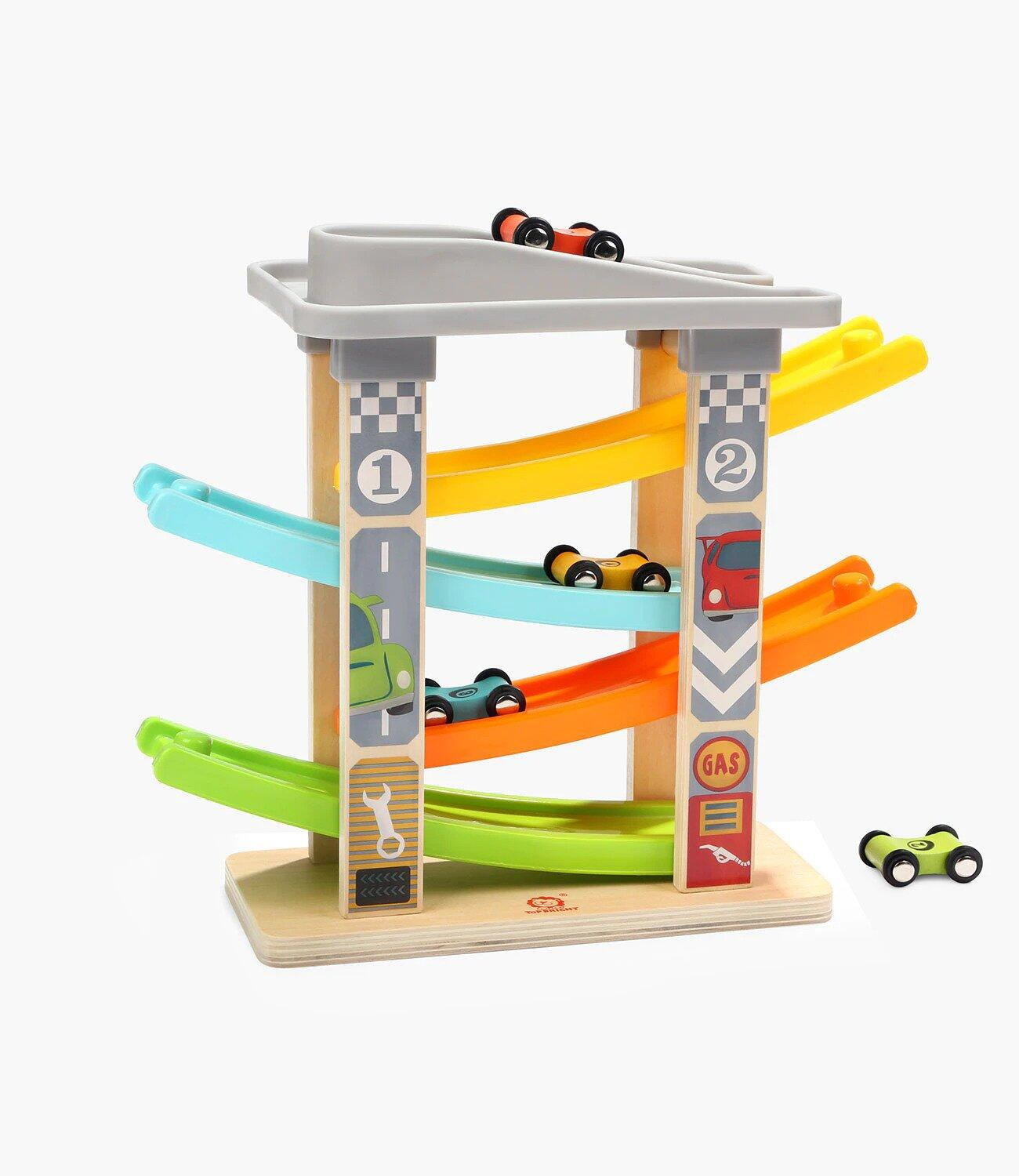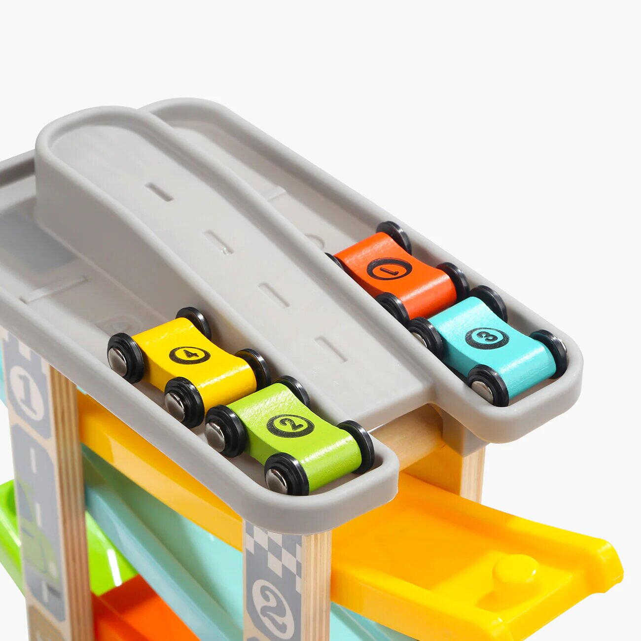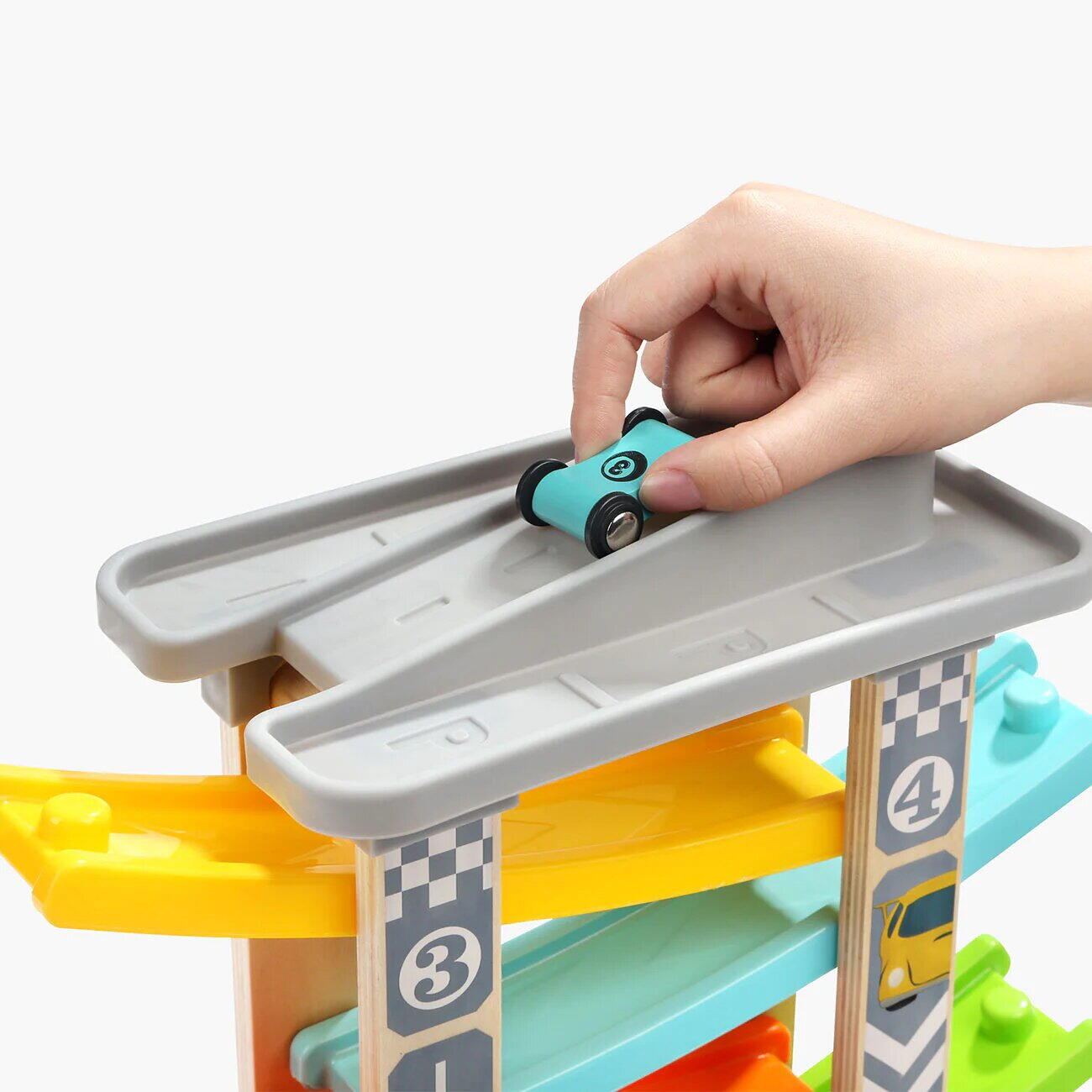 • copilul aseaza masinuta in partea de sus a rampei si o impinge usor, aceasta va urma traseul pana jos, la linia de sosire