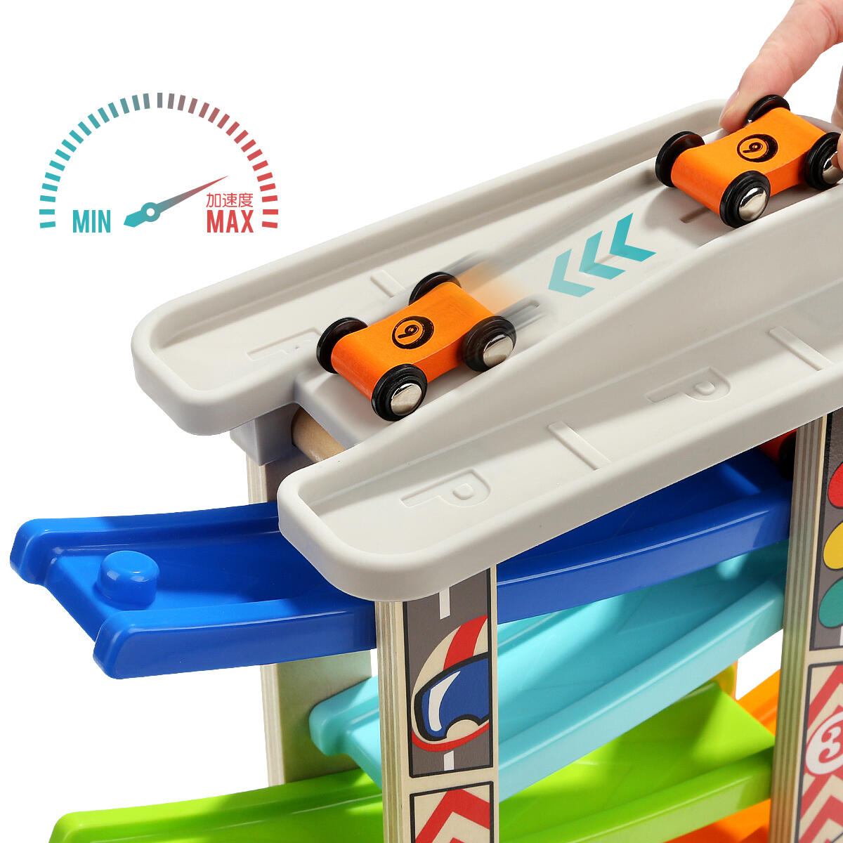 Aceste masinute de curse se deplaseaza in jos pe rampa cu o viteza uluitoare si efectueaza salturi de la un nivel la altul.