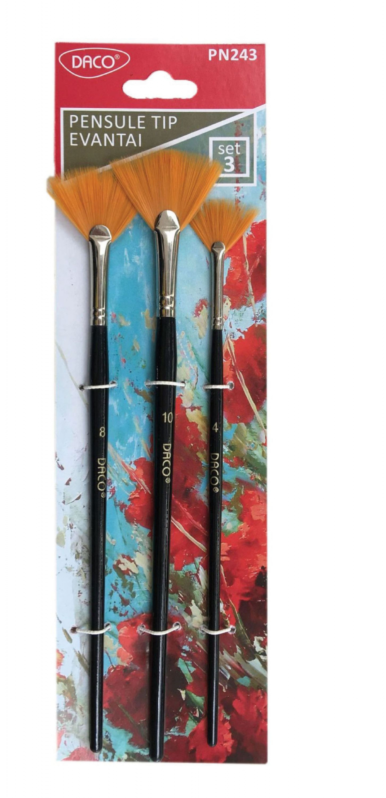 Pensule tip evantai set 3 Daco• pensule cu vârf tip evantai, păr sintetic, virolă nichelată• numere incluse: 4, 8, 10