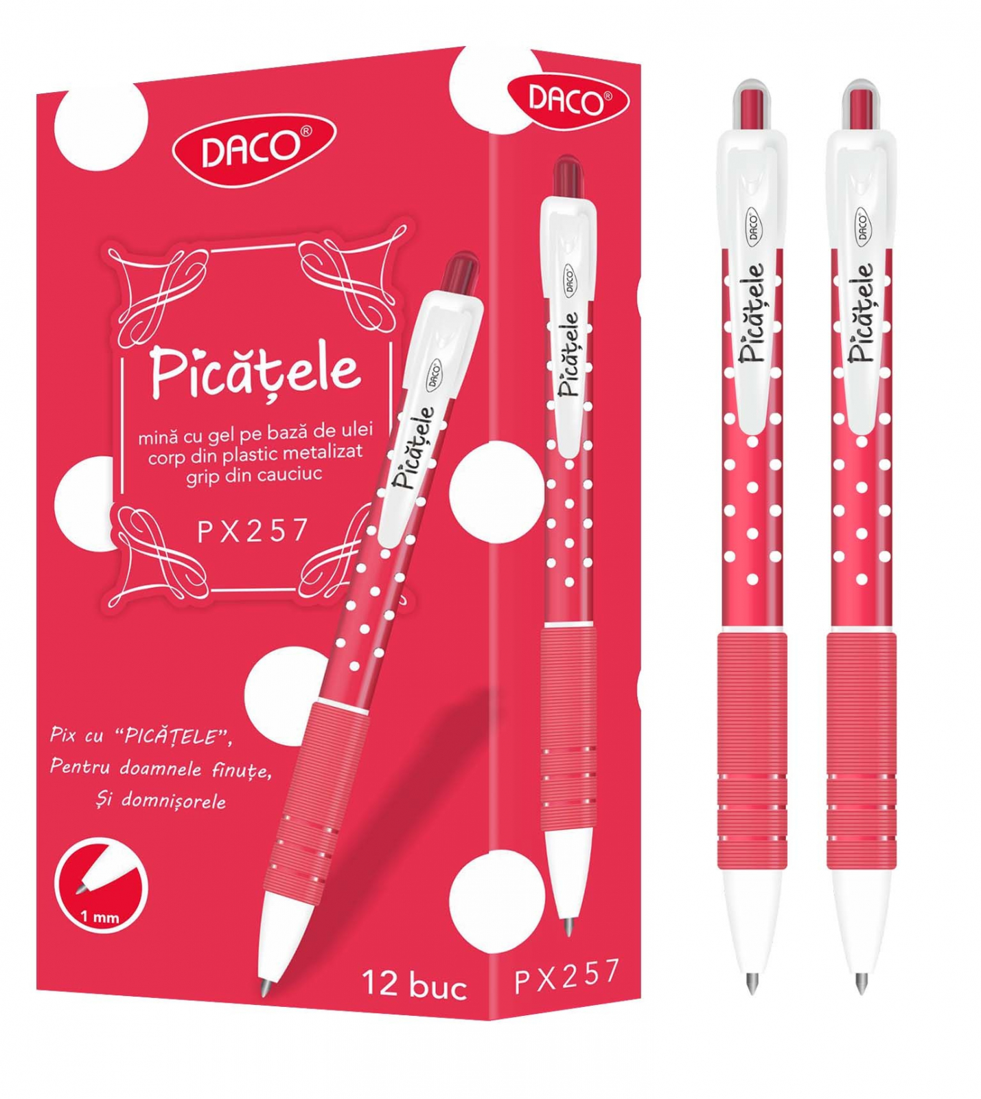 Pix Daco Picățele•  grosime vârf: 1 mm•  mină gel pe bază de ulei•  corp din plastic•  culori mină: albastru, roșu