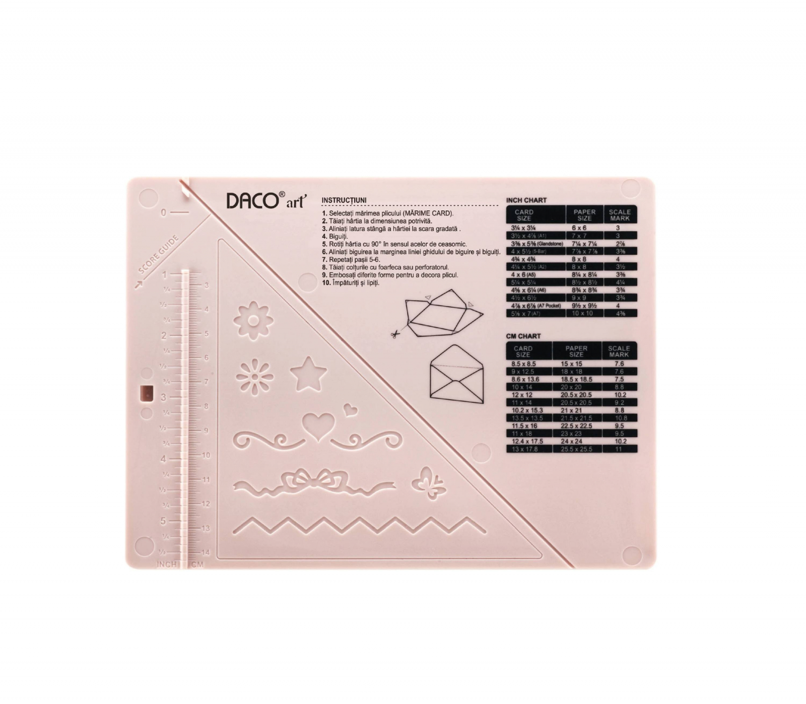 Dimensiuni placa: 21,5 x 16 cmPotrivita pentru a crea felicitari, plicuri si alte indoituri ale hartiei.Permite crearea mai multor dimensiuni de proiecte.Contine cutit pentru biguire si embosare.
