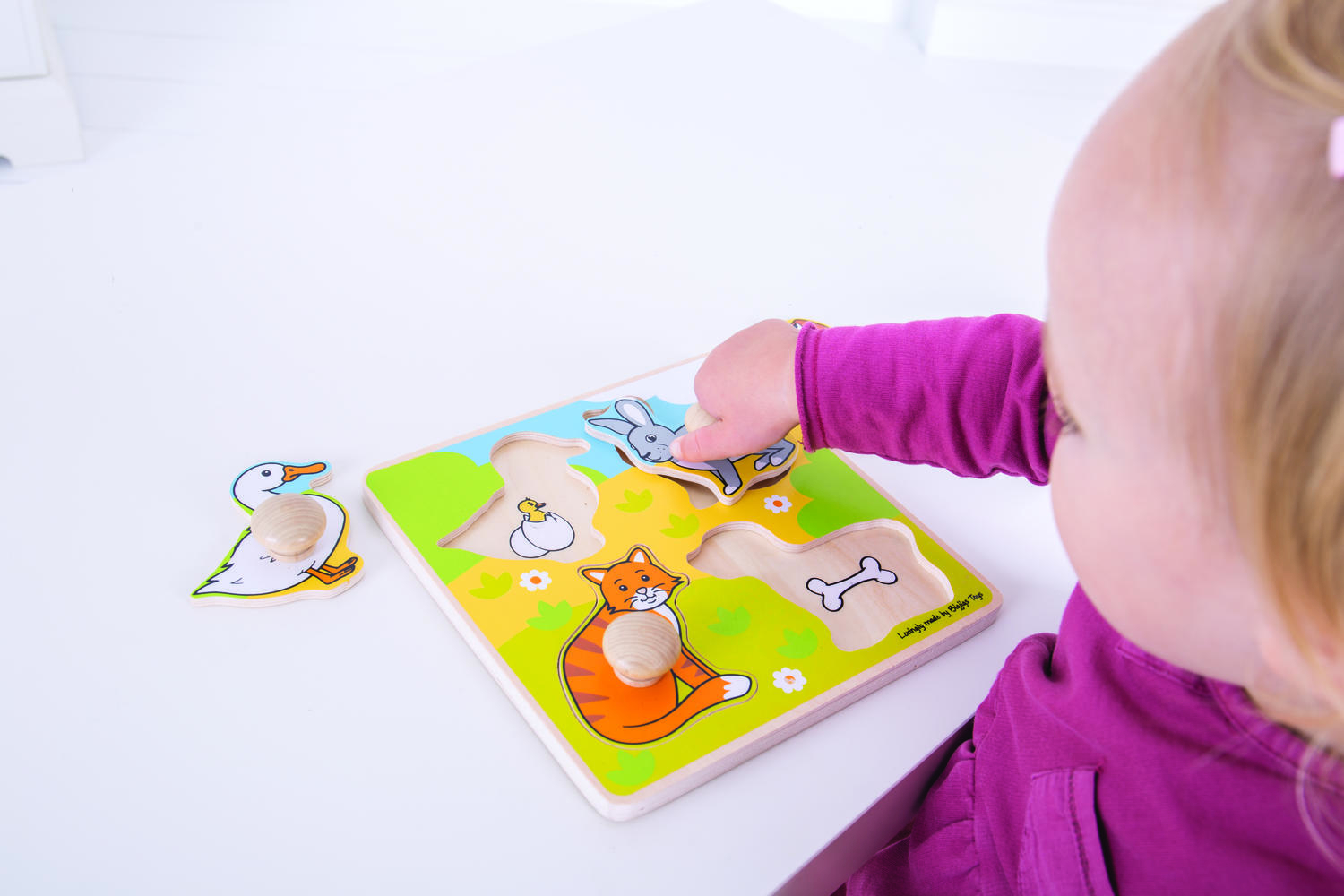 • contine 4 piese tip puzzle cu diferite animale: ratusca, iepure, pisica si catel