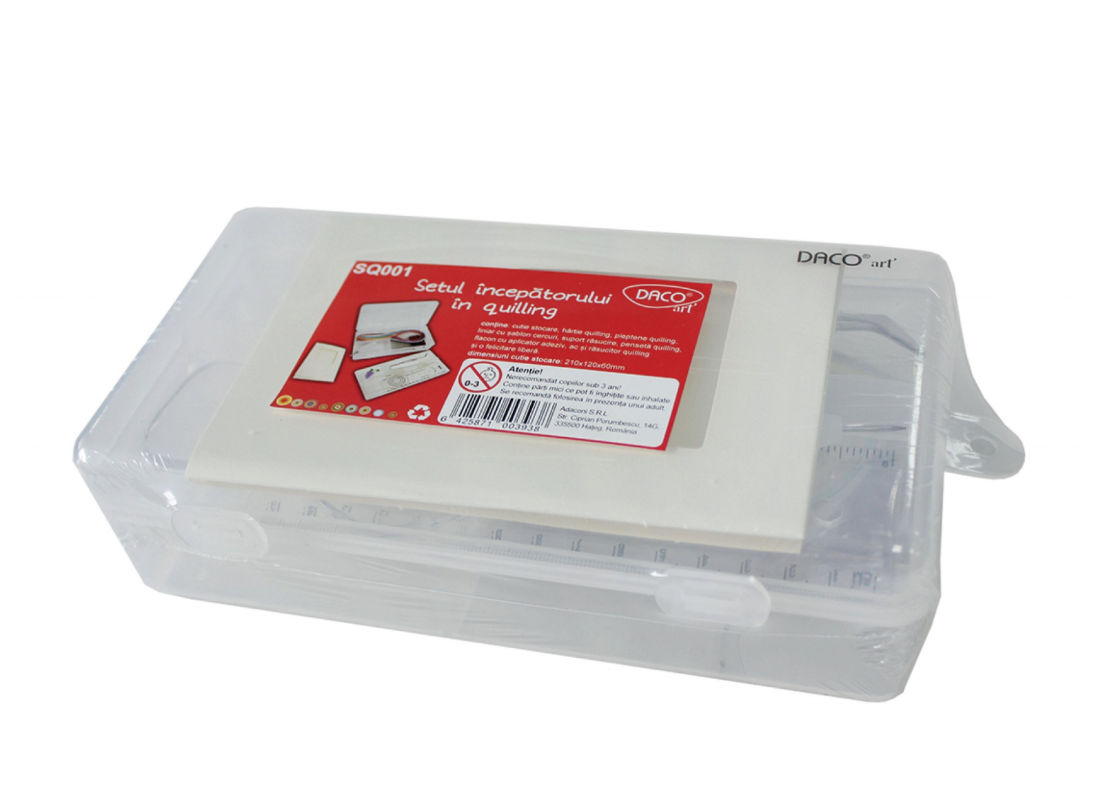 Setul contine: cutie stocare, hartie quilling, pieptene quilling, liniar cu sablon cercuri, suport rasucire, penseta quilling, flacon aplici lipici, ac quilling 2 capete si o felicitare libera.Dimensiuni cutie stocare: 21 x 12 x 6 cm