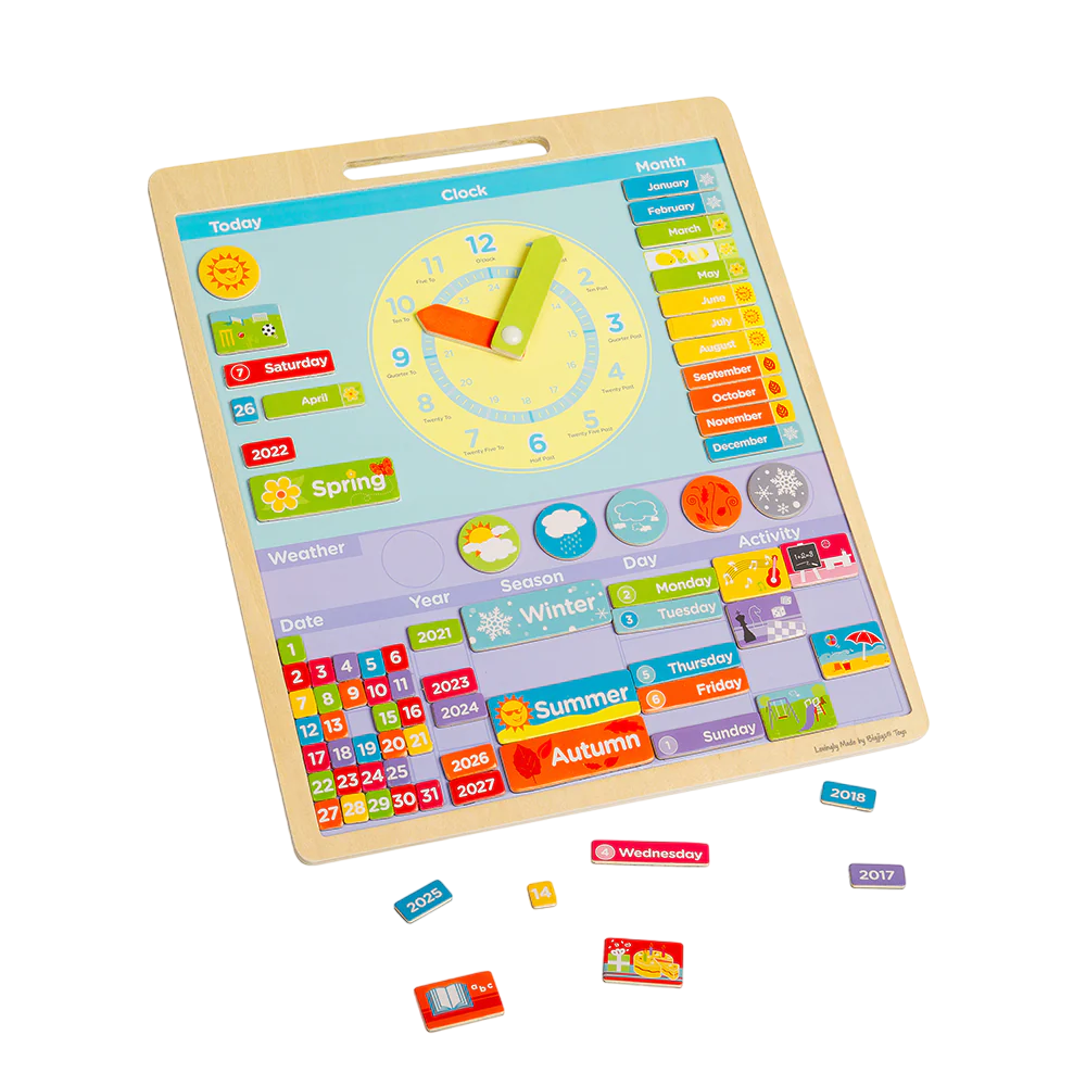 Calendarul magnetic "Vremea" (calendarul naturii magnetic) in limba engleza, ii ofera copilului sansa de a afla cat mai multe despre fenomenele meteorologice si sa invete despre timp, anotimpuri, luni si zilele saptamanii intr-un mod interactiv si captivant.